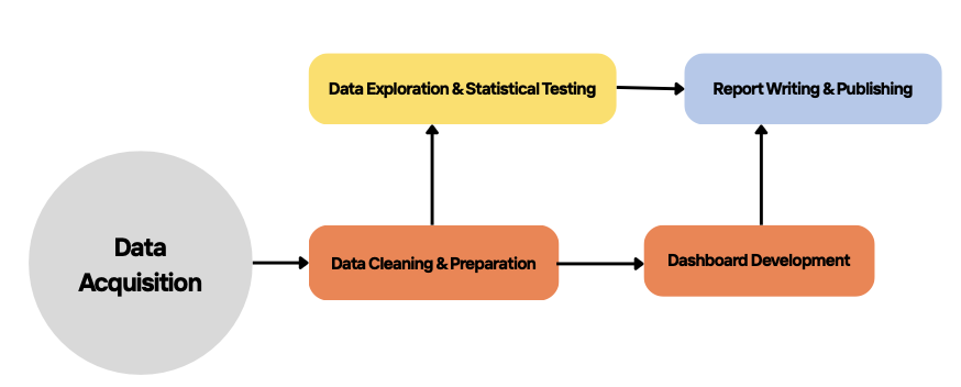 โปรเจกต์นี้ดำเนินการตามขั้นตอนที่เป็นระบบ เพื่อให้ได้ข้อมูลที่พร้อมวิเคราะห์ และสร้างเครื่องมือสื่อสารผลลัพธ์ที่เข้าใจง่าย