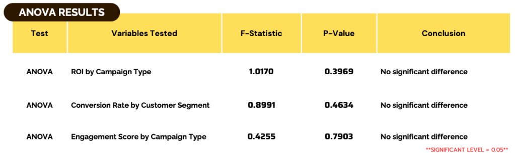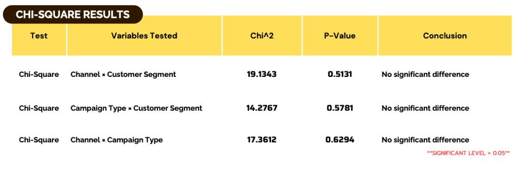 - ไม่พบความแตกต่างอย่างมีนัยสำคัญระหว่างกลุ่มลูกค้าหรือประเภทแคมเปญ จากการทดสอบทางสถิติ (ANOVA และ Chi-Square)